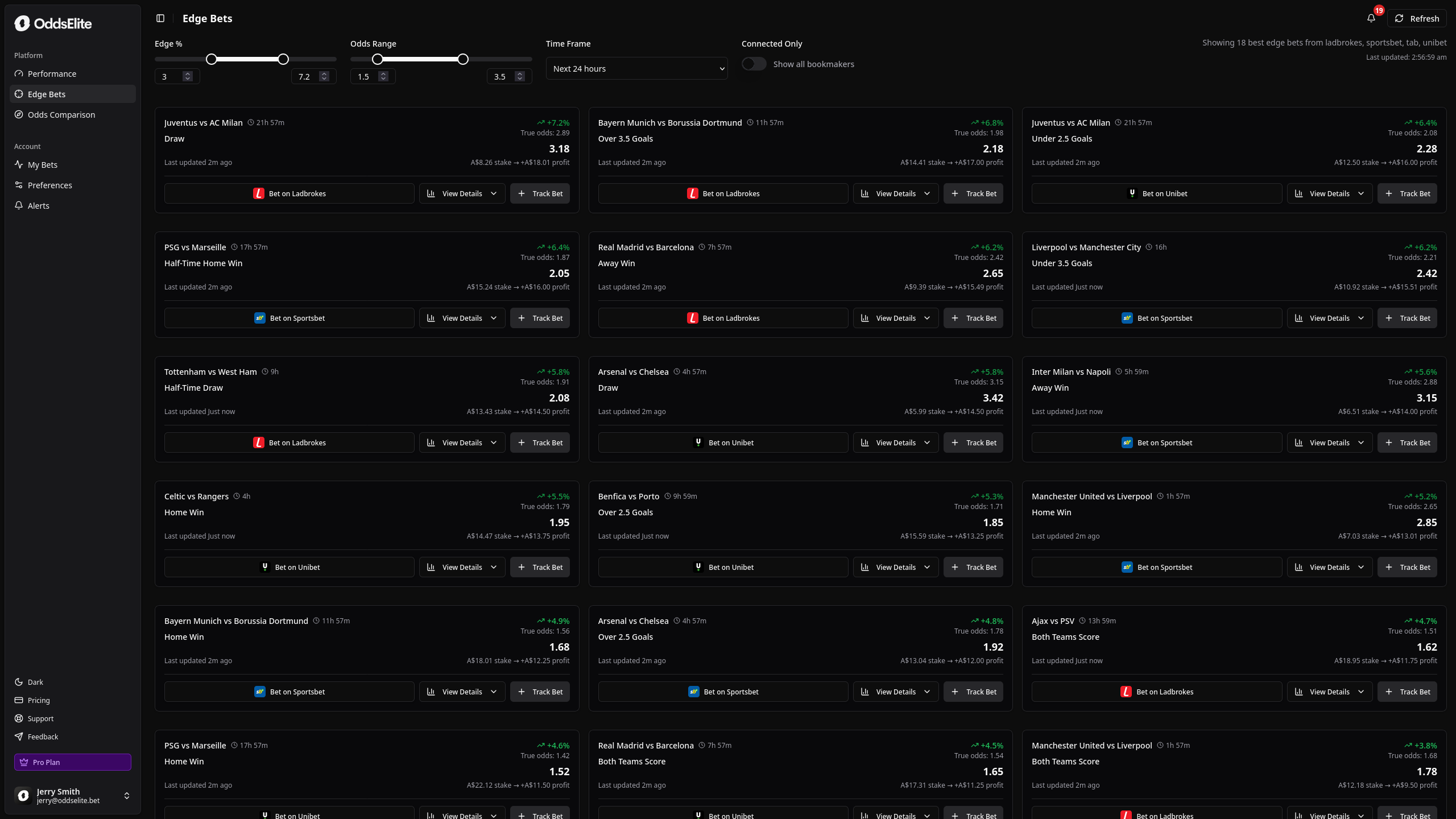 We currently track odds from Sportsbet, Ladbrokes, Unibet, and Sbobet, with more being added regularly.